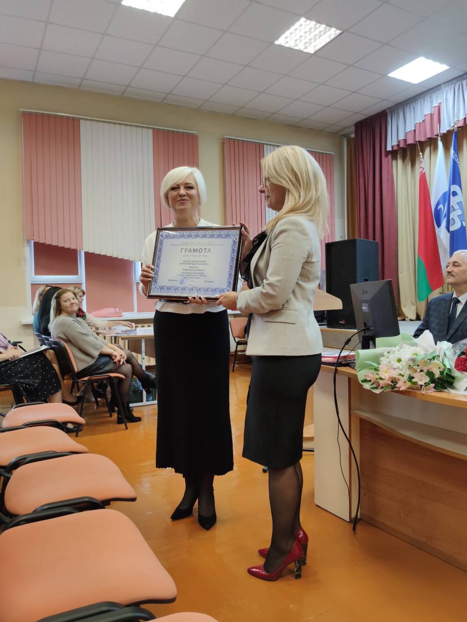 За плодотворное сотрудничество, высокий профессионализм и поддержку профсоюзного движения Вилейским районным исполнительным комитетом в адрес председателя райисполкома Анатолия Николаевича Татьяна Апранич вручила Грамоту Минского областного комитета Белорусского профессионального союза работников образования и науки.