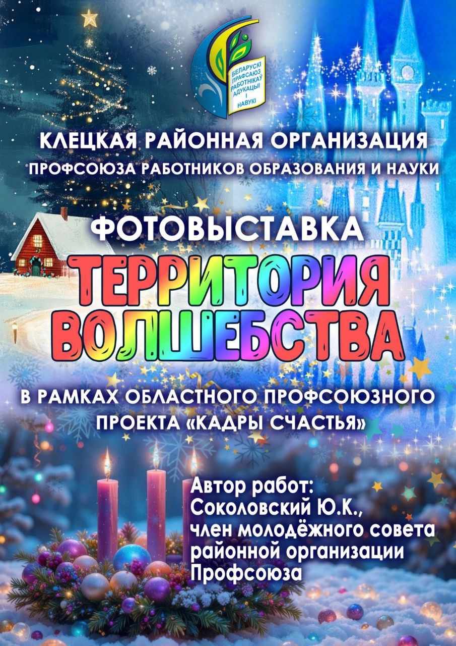 19.12.2025Мир кажется сложным, люди разобщены... Но гости районного фестиваля творчества "Зажги свою звезду" имели возможность на мгновение остановиться и посмотреть на мир под другим углом. В фойе государственного учреждения «Клецкий районный центр культуры» в рамках реализации областной профсоюзной инициативы "Кадры счастья" - фотовыставка "Территория волшебства". На снимках - 14 воспитанников ГУО «Центр коррекционно-развивающего обучения и реабилитации Клецкого района». Они особенные дети - дети с добрыми, трогательными глазами, дети, которые искренне верят в волшебство и ждут чуда. А уникальную возможность стать героем любимой сказки подарил ребятам автор фоторабот Юрий Соколовский, член молодежного совета районной организации Профсоюза.