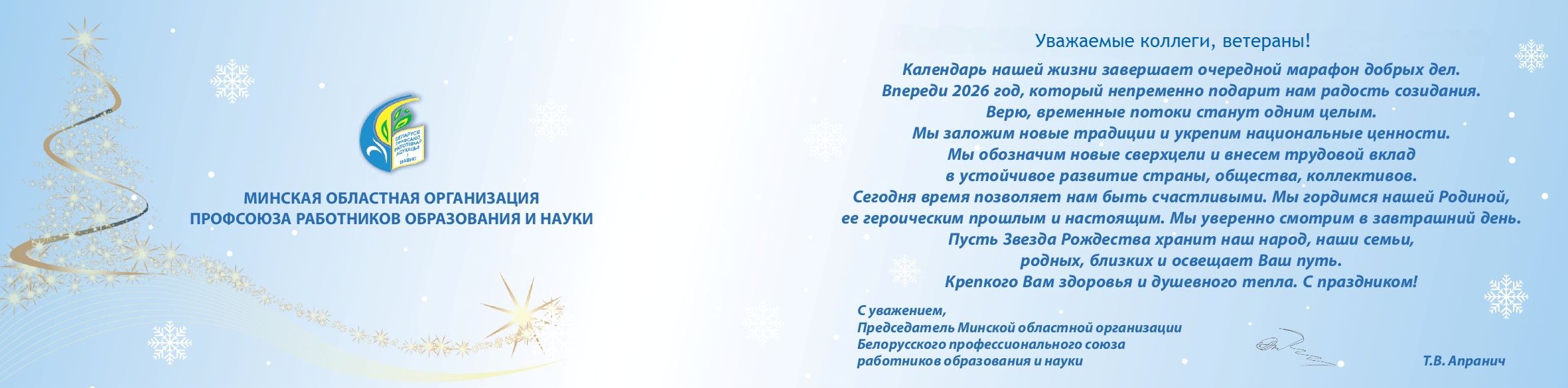 Поздравление с Новым годом и Рождеством от председателя Минской областной организации Профсоюза Апранич Т.В.